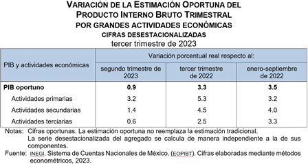 En los primeros nueve meses de 2023 y con series desestacionalizadas, el PIB oportuno aumentó 3.5 % a tasa anual.