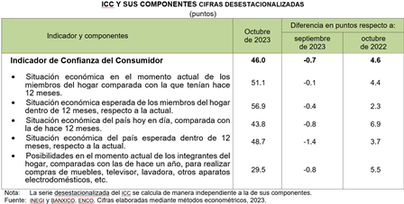 En octubre de 2023 y en términos desestacionalizados, el ICC registró un incremento anual de 4.6 puntos.