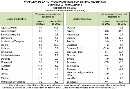 En septiembre de 2023 y con cifras ajustadas por estacionalidad, las entidades federativas que registraron los crecimientos mensuales más pronunciados en su actividad industrial, en términos reales, fueron: San Luis Potosí, Guanajuato, Oaxaca, Colima y Tamaulipas.