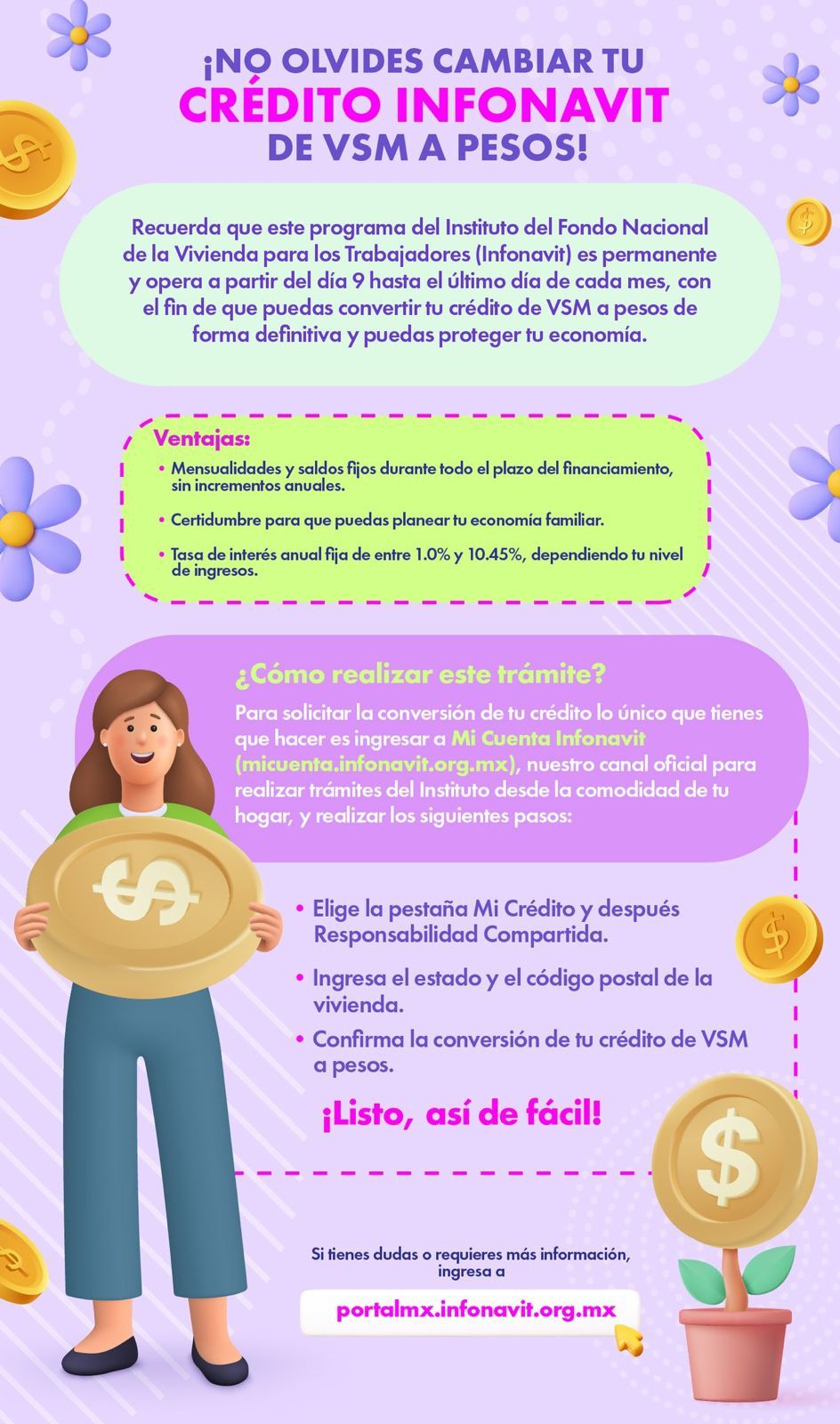 Si tienes un Crédito Infonavit y está denominado en Veces Salario Mínimo (VSM), el saldo total de tu deuda y tu mensualidad aumentarán en 2024, para evitarlo debes cambiar tu crédito a pesos a través de la Ventanilla Universal de Responsabilidad Compartida.