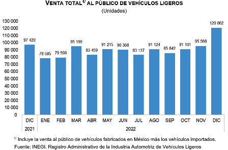 En diciembre, se vendieron al público en el mercado interno 120 862 unidades. Por su parte, en el periodo enero-diciembre de 2022 se comercializaron 1 086 058 unidades.