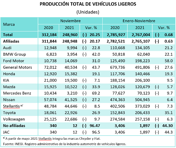 La producción total de vehículos ligeros en México, para el periodo enero-noviembre de 2021 es de 2 767 004 unidades, se muestra que los camiones ligeros representan 76.1% del total, mientras que el resto corresponde a la fabricación de automóviles.