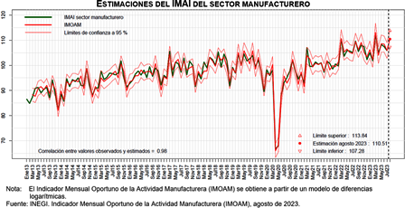 Para agosto de 2023 y con series sin ajuste estacional, el Indicador Mensual Oportuno de la Actividad Manufacturera (IMOAM) tiene un valor de 110.5 puntos, como cálculo anticipado del Indicador Mensual de la Actividad Industrial (IMAI) del sector manufacturero.