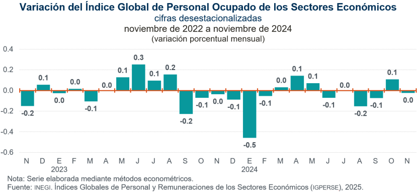 En noviembre de 2024 y con cifras ajustadas por estacionalidad, el IGPOSE presentó un nivel de 98.8 puntos: no mostró variación con relación a octubre pasado. A tasa anual registró un descenso de 0.6 por ciento.