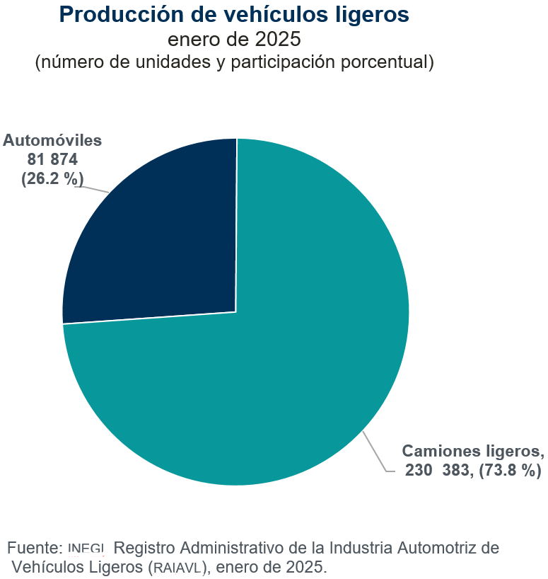 Durante enero de 2025, se produjeron 312 mil 257 unidades, lo que representó una variación de 1.7 % respecto al mismo lapso de 2024. Durante el mes citado, los camiones ligeros representaron 73.8 % del total producido, mientras que el resto correspondió a la fabricación de automóviles.