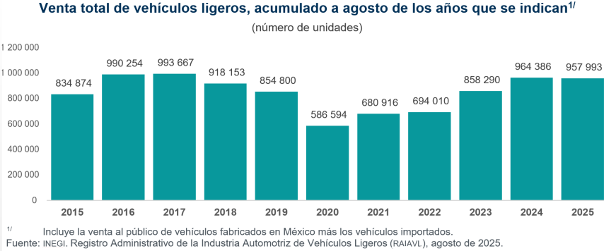 En la gráfica se muestra las ventas acumuladas de enero a agosto para cada año desde 2015. Entre enero y agosto de 2025, se reportan 957 mil 993 vehículos comercializados; una caída de 0.7 % respecto al mismo periodo del año inmediato anterior.