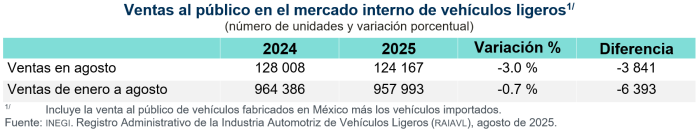 En la gráfica se muestra las ventas acumuladas de enero a agosto para cada año desde 2015. Entre enero y agosto de 2025, se reportan 957 mil 993 vehículos comercializados; una caída de 0.7 % respecto al mismo periodo del año inmediato anterior.