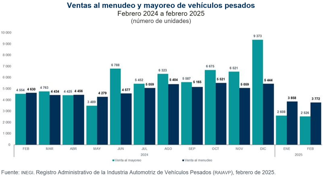 Para el periodo enero-febrero de 2025, se exportaron 22 mil m 520 unidades, lo que representó una variación de -16.8 % respecto al mismo lapso de 2024. Estados Unidos fue el principal destino de las exportaciones de vehículos pesados, con 95.9 % del total.