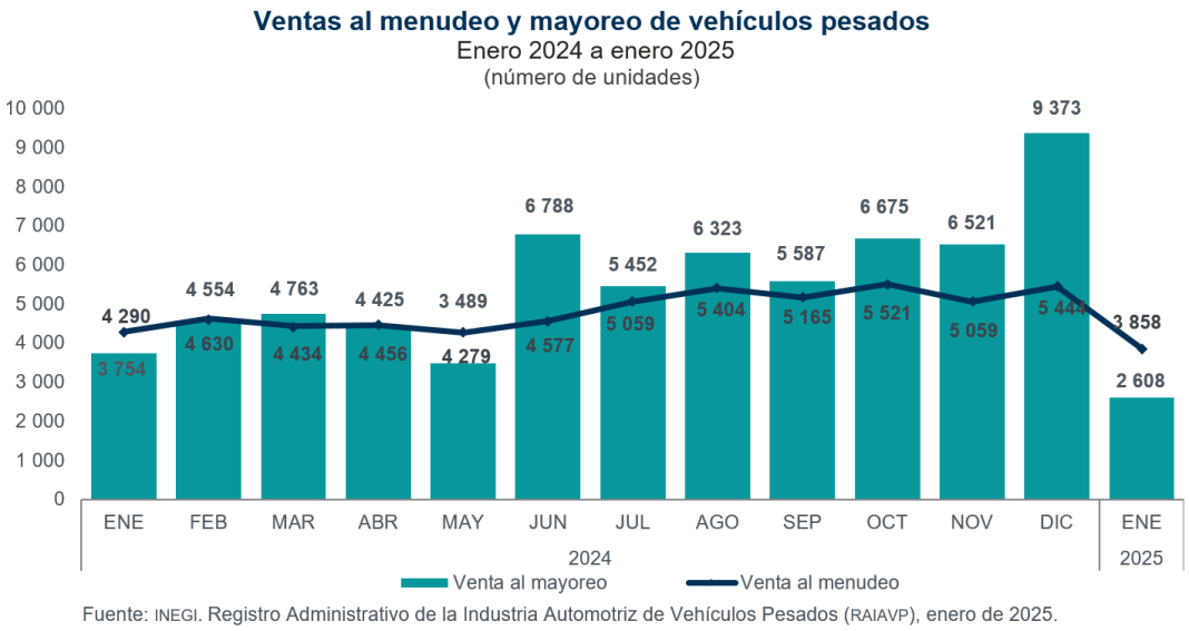 Durante enero de 2025, se produjeron 14 mil 108 vehículos pesados, lo que representó una variación de -9.5 %, respecto al mismo lapso de 2024.