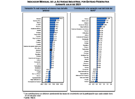 En su comparación anual, las entidades que registraron los incrementos más significativos en términos reales en su Producción Industrial fueron: Oaxaca, Quintana Roo, México, Chiapas, Tabasco, Ciudad de México y Yucatán, con series desestacionalizadas, frente al séptimo mes de 2020.