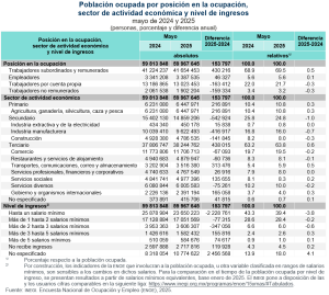 Del total de la población ocupada (60.0 millones), 41.7 millones (69.5 %) operaron como trabajadoras o trabajadores subordinados y remunerados al ocupar una plaza o puesto de trabajo, lo que representó un aumento anual de 430 mil. Además, 13.0 millones (21.7 %) trabajaron de manera independiente o por su cuenta sin contratar empleadas o empleados: 163 mil personas menos respecto a mayo de 2024.