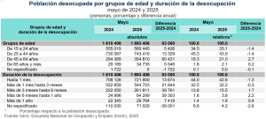 En el mes de referencia, la población desocupada fue de 1.7 millones de personas, un ascenso anual de 83 mil. La población femenina desocupada se ubicó en 632 mil, en mayo de 2024, y en 715 mil, en mayo de este año. La población masculina desocupada se ubicó ligeramente por debajo de un millón, en mayo de 2024, cifra similar a la de mayo de este año.