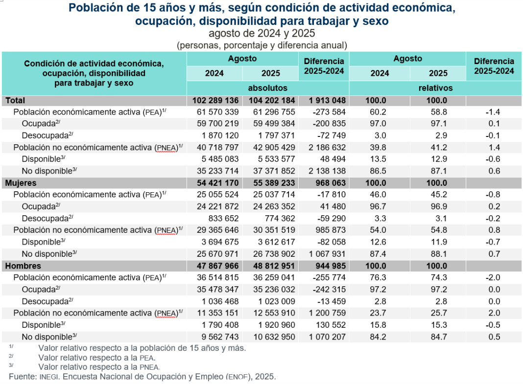 La población no económicamente activa (PNEA) fue de 42.9 millones de personas (41.2 % de la población de 15 años y más): creció en 2.2 millones de personas respecto a agosto de 2024. De esta categoría, 5.5 millones se declararon disponibles para trabajar, pero no llevaron a cabo acciones para hacerlo, por lo que constituyen el grupo que eventualmente podría participar en el mercado laboral. En términos relativos, la PNEA disponible representó 12.9 por ciento. En agosto de 2024, fue de 13.5 %.