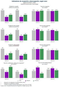 En el mes de referencia, la población desocupada fue de 1.8 millones de personas, una reducción anual de 73 mil. La desocupación de mujeres se ubicó en 834 mil en agosto de 2024, y en 774 mil en agosto de este año. La desocupación de hombres se mantuvo en un millón, en el octavo mes de 2024 y de 2025.