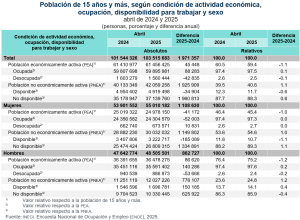 En abril de 2025, la tasa de participación económica (porcentaje de la población que se encontró trabajando, o que no tuvo empleo, pero estaba en la búsqueda activa de uno) se ubicó en 59.4 por ciento. Para abril de 2024, fue de 60.5 por ciento.
