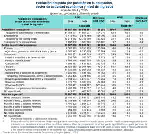 Del total de la población ocupada (59.9 millones), 41.6 millones (69.5 %) operaron como trabajadoras o trabajadores subordinados y remunerados al ocupar una plaza o puesto de trabajo, lo que representó un ascenso anual de 424 mil. Además, 12.7 millones (21.3 %) trabajaron de manera independiente o por su cuenta sin contratar empleadas o empleados: 481 mil personas menos respecto a abril de 2024. Por su parte, 3.6 millones (6.0 %) fueron personas empleadoras, cifra que subió en 401 mil. Finalmente, 2.0 millones de personas (3.3 %) se desempeñaron en los negocios o en las parcelas familiares, es decir, contribuyeron de manera directa a los procesos productivos, pero sin un acuerdo de remuneración monetaria. Lo anterior significó un descenso anual de 257 mil.