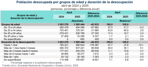 En el mes de referencia, la población desocupada fue de 1.6 millones de personas, una reducción anual de 43 mil. La población femenina desocupada se ubicó en 663 mil, en abril de 2024, y en 674 mil, en abril de este año. La población masculina desocupada pasó de 941 mil, en el cuarto mes de 2024, a 887 mil, en abril pasado.