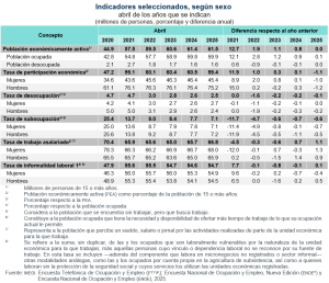 En abril de 2025, la PEA fue de 61.5 millones de personas de 15 años y más -población que, durante la semana de referencia, realizó o tuvo un vínculo con una actividad económica (población ocupada), o buscó activamente hacerlo (población desocupada en las últimas cuatro semanas)-, lo que representó una tasa de participación de 59.4 %). Dicha cantidad significó un aumento de 45 mil personas con relación a abril de 2024. Al distinguir por sexo, la tasa de participación económica de las mujeres fue de 45.4 % y la de hombres, de 75.2 por ciento. Respecto al año anterior, la participación de mujeres disminuyó 1.0 punto porcentual y la de hombres, 1.2.