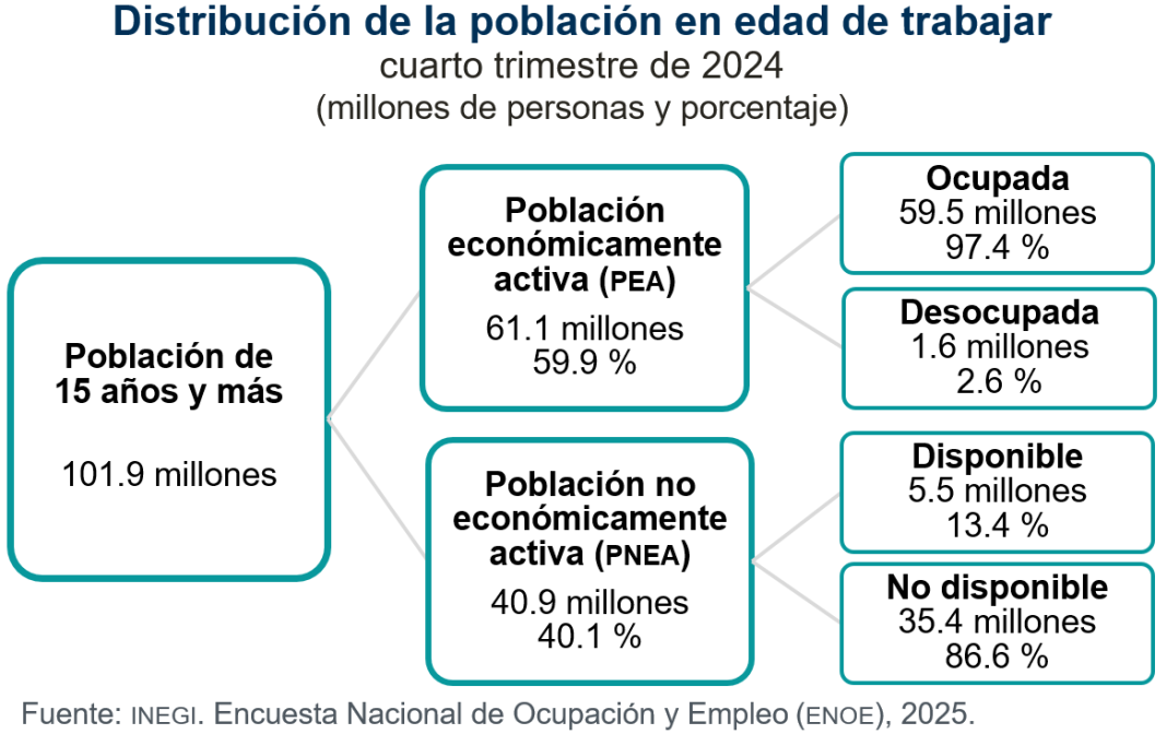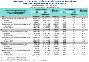 Durante el cuarto trimestre de 2024, la PEA fue de 61.1 millones de personas (una tasa de participación de 59.9 %). Un año antes fue de 61.0 millones (60.5 %), lo que significó un incremento de 12 mil personas.