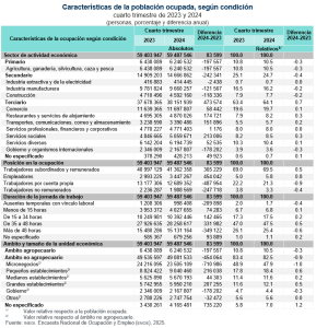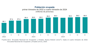Un total de 59.5 millones de personas estuvieron ocupadas: 84 mil más en relación con el cuarto trimestre de 2023. Los sectores de actividad económica con los mayores crecimientos en su población ocupada fueron: servicios sociales; restaurantes y servicios de alojamiento, así como transportes, comunicaciones, correo y almacenamiento.