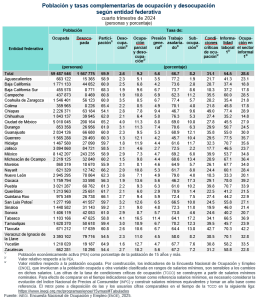 La tasa de ocupación mostró que el porcentaje de personas ocupadas fue superior en Guerrero (98.7 %), Michoacán (98.5 %), Yucatán (98.4 %), Hidalgo (98.2%), entre otras.