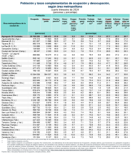 En el periodo octubre-diciembre de 2024, la PEA para el agregado urbano de 39 ciudades fue de 30.7 millones de personas y representó una tasa de participación de 61.6 por ciento. Asimismo, se reportó una TD de 3.0 %, una tasa de subocupación de 7.0 %, una TCCO de 27.7 % y una TIL1 de 43.1 por ciento.
