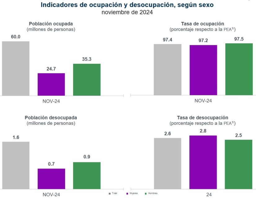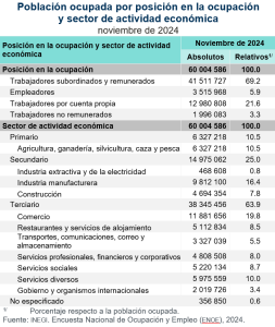 En noviembre de 2024, la población ocupada en la informalidad laboral fue de 32.8 millones de personas y la tasa de informalidad laboral 1 (TIL1) se estableció en 54.6 % de la población ocupada. La TIL1 urbana fue de 44.1 por ciento.