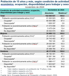 En noviembre de 2024, la PEA fue de 61.6 millones de personas de 15 años y más -población que, durante la semana de referencia, realizó o tuvo un vínculo con una actividad económica (población ocupada), o buscó activamente hacerlo (población desocupada en las últimas cuatro semanas)-. Al distinguir por sexo, la tasa de participación económica de las mujeres fue de 46.7 % y la de hombres, de 75.1 por ciento.
