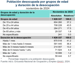 En lo que respecta a las características sociodemográficas de la población desocupada, por rangos etarios, la mayor proporción se concentró en el grupo de 25 a 44 años, con 43.5 por ciento. Siguió el grupo de 15 a 24 años, con 37.2 por ciento.
