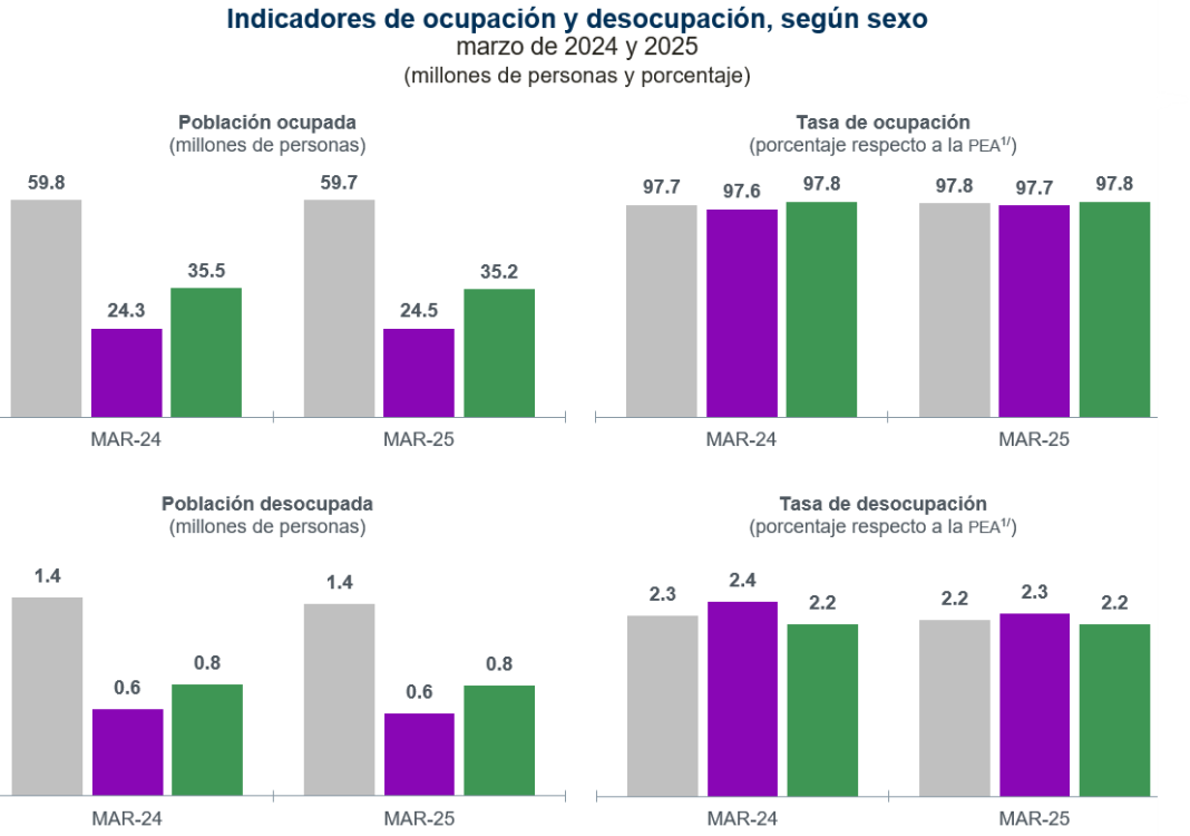 La población ocupada alcanzó 59.7 millones de personas -población que durante la semana de referencia realizó alguna actividad económica durante al menos una hora. Incluye ocupados que tenían trabajo, pero no lo desempeñaron temporalmente por alguna razón, sin que por ello perdieran el vínculo laboral con este, así como a quienes ayudaron en alguna actividad económica sin recibir un sueldo o salario-, (97.8 % de la PEA): un descenso anual de 88 mil personas. Según sexo, la ocupación de mujeres fue de 24.5 millones (un alza de 144 mil) y la de hombres, de 35.2 millones (una caída de 232 mil).