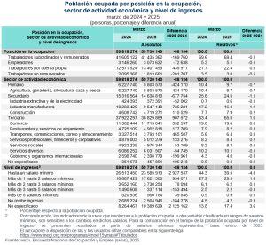 Del total de la población ocupada (59.7 millones), 41.4 millones (69.4 %) operaron como trabajadoras o trabajadores subordinados y remunerados al ocupar una plaza o puesto de trabajo, lo que representó un descenso anual de 170 mil. Además, 13.4 millones (22.4 %) trabajaron de manera independiente o por su cuenta sin contratar empleadas o empleados: 436 mil personas más respecto a marzo de 2024. Por su parte, 3.1 millones (5.1 %) fueron personas empleadoras, cifra que disminuyó en 73 mil. Finalmente, 1.8 millones de personas (3.0 %) se desempeñaron en los negocios o en las parcelas familiares, es decir, contribuyeron de manera directa a los procesos productivos, pero sin un acuerdo de remuneración monetaria. Lo anterior significó una reducción anual de 282 mil.