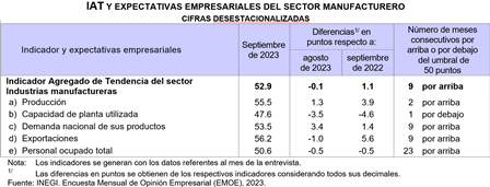 En septiembre de 2023 y con cifras desestacionalizadas, el Indicador Agregado de Tendencia (IAT) del sector manufacturero fue de 52.9 puntos, lo que significó una caída mensual de 0.1 puntos.