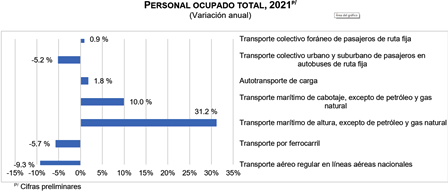 En 2021, el personal ocupado mostró retrocesos en tres de los siete tipos de transporte registrados. Transporte aéreo regular en líneas aéreas nacionales registró la mayor caída, con una tasa de 9.3 por ciento. Transporte marítimo de altura, excepto de petróleo y gas natural creció 31.2 % y Transporte colectivo foráneo de pasajeros de ruta fija, 0.9 por ciento.