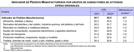 El Instituto Nacional de Estadística y Geografía (INEGI) y el Banco de México dan a conocer el Indicador de Pedidos Manufactureros (IPM) de julio de 2022. El IPM incorpora variables similares a las del Purchasing Managers Index (PMI) que elabora el Institute for Supply Management (ISM) en Estados Unidos de América.