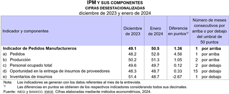 En enero de 2024 y con cifras desestacionalizadas, el IPM mostró un incremento mensual de 1.36 puntos y se ubicó en 50.5 puntos, luego de permanecer durante los tres meses anteriores por debajo del umbral de 50 puntos.