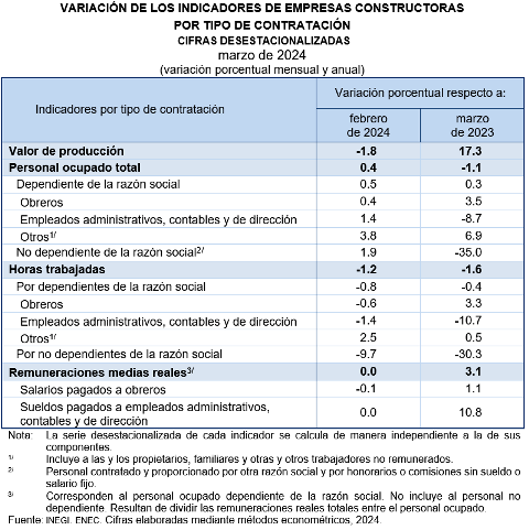 En el tercer mes de 2024 y a tasa anual, el valor real de producción en las empresas constructoras creció 17.3 % y las remuneraciones medias reales pagadas, 3.1 por ciento. El personal ocupado total descendió 1.1 % y las horas trabajadas, 1.6 por ciento.