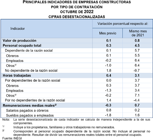 En octubre de 2022 y a tasa anual, el valor real de la producción en las empresas constructoras creció 0.8 %; el personal ocupado total, 4.5 %; las horas trabajadas, 3.1 % y las remuneraciones medias reales pagadas, 0.7 por ciento.
