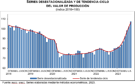 En agosto de 2023 y con datos ajustados por estacionalidad, el valor de la producción generado por las empresas constructoras aumentó 5 %, en términos reales, respecto a julio pasado; el personal ocupado total incrementó 0.9 %; las horas trabajadas, 1 % y las remuneraciones medias reales, 3.3 por ciento.