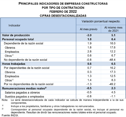 En febrero de 2022 y con datos ajustados por estacionalidad, los resultados de la Encuesta Nacional de Empresas Constructoras (ENEC) indican que el valor de la producción generado por las empresas constructoras descendió 3% en términos reales respecto a enero pasado.