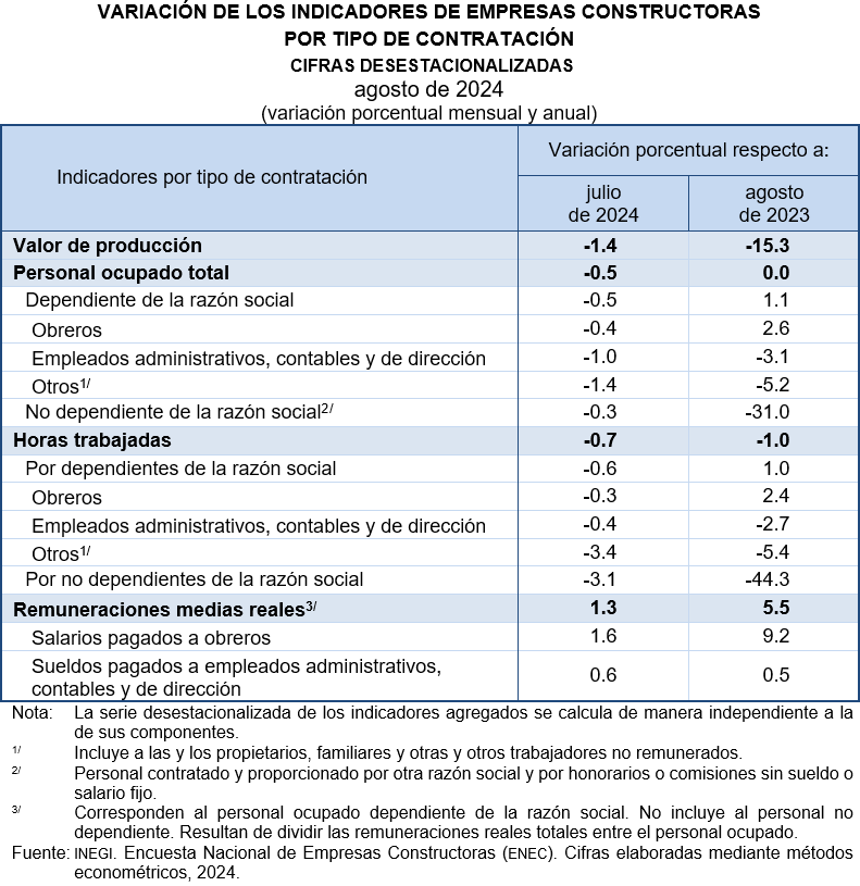 En el octavo mes de 2024 y a tasa mensual, el personal ocupado total en la industria de la construcción retrocedió 0.5 por ciento. Por tipo de contratación, el personal dependiente de la empresa descendió 0.5 % (el número de las y los obreros bajó 0.4 %; el de las y los empleados administrativos, contables y de dirección, 1.0 %, y el grupo de «otros» —que incluye a personas propietarias, familiares, así como a otras y otros trabajadores sin remuneración— 1.4 %). El personal no dependiente cayó 0.3 por ciento.