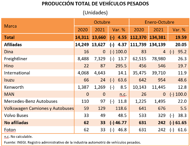 En el periodo enero-octubre de 2021, se muestra que la producción de vehículos pesados en México se concentra en los vehículos de carga que representan 97.9% del total; el resto corresponde a la fabricación de autobuses para pasajeros.