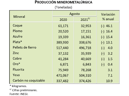 La producción minerometalúrgica descendió 5.1% durante el octavo mes del año en curso con relación a la del mismo mes de 2020; a su interior, cayó la producción de coque, plomo, azufre, plata, pellets de fierro, zinc, cobre y la de oro. En contraste, se incrementó la de carbón no coquizable, yeso y la de fluorita.