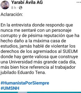 Este Martes dejó en claro que al haber afirmado en días pasados que «nunca me sentaré con un personaje corrupto y de pésima reputación que ha hecho daño a la máxima casa de estudios», jamás habló de violentar los derechos de los agremiados al Sindicato Único de Empleados «donde hay gente valiosa que construye una Universidad más grande cada día, más bien hice referencia al trabajador jubilado Eduardo Tena», enfatizó.
