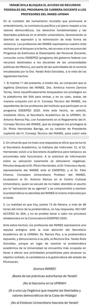 Las represalias en contra de la comunidad de este que es el Instituto de Investigaciones Económicas y Empresariales no han parado desde los primeros meses del año pasado en que hubo un primer intento de destituir a Zamora Torres de parte de Rectoría argumentando un presunto error en su plan de trabajo 2024, en el cual empataba horarios de clases lo cual no es un argumento para destitución. Es así que este día en rueda de prensa los profesores y la comunidad del ININEE además de su directora han ofrecido una rueda de prensa en donde han denunciado que de todo ello ha derivado que ahora la rectora,  a través de la Secretaría Académica que hoy encabeza Antonio Ramos Paz, les está impidiendo acceder a recursos federales, y les ha impedido también acceder a recursos de las becas del CONAHCYT ya que la mayoría de los profesores de este instituto nicolaita están en el Sistema Nacional de Investigadores. Y es que es el funcionario universitario quien tiene la facultad para darles el acceso a través de la plataforma del SIIA que es el Sistema de Información Administrativa, para completar el proceso de acceso a esos recursos, argumentando «una falla técnica».