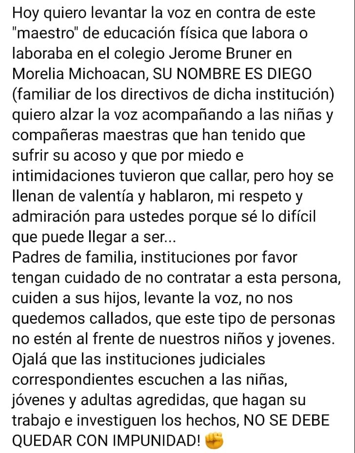 Alumnas del colegio Jerome Bruner de Morelia, denunciaron el acoso sexual del que han sido víctimas por dos profesores de educación física de esta institución particular.