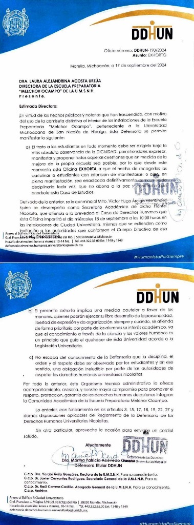 Es por ello que Marta Patricia Acevedo, quien es titular de la Defensoría de los Derechos Humanos Universitarios Nicolaita (DDHUN) envió de inmediato un documento oficial a la directora de la Prepa 5, Laura Alejandrina Acosta Urzúa, en donde condena que en virtud de los hechos públicos y notorios que han trascendido con motivo del uso de la camiseta distintiva al interior de las instalaciones de esta escuela preparatoria, la Defensoría manifiesta que el trato a los estudiantes en todo momento debe ser dirigido «bajo la más absoluta observancia de la dignidad» permitiéndoles expresar, manifestar y proponer todas aquellas cuestiones que en medida de la mejora de la propia escuela sea posible, «por lo que desde este momento esta oficina exhorta a que el hecho de recogerle las cartulinas a estudiantes que tenían la intención de manifestarse o bien en plena manifestación sea erradicada definitivamente como medida disciplinaria toda vez que no abona a la paz y concordia que enarbola esta Casa de Estudios que es la Universidad Michoacana».