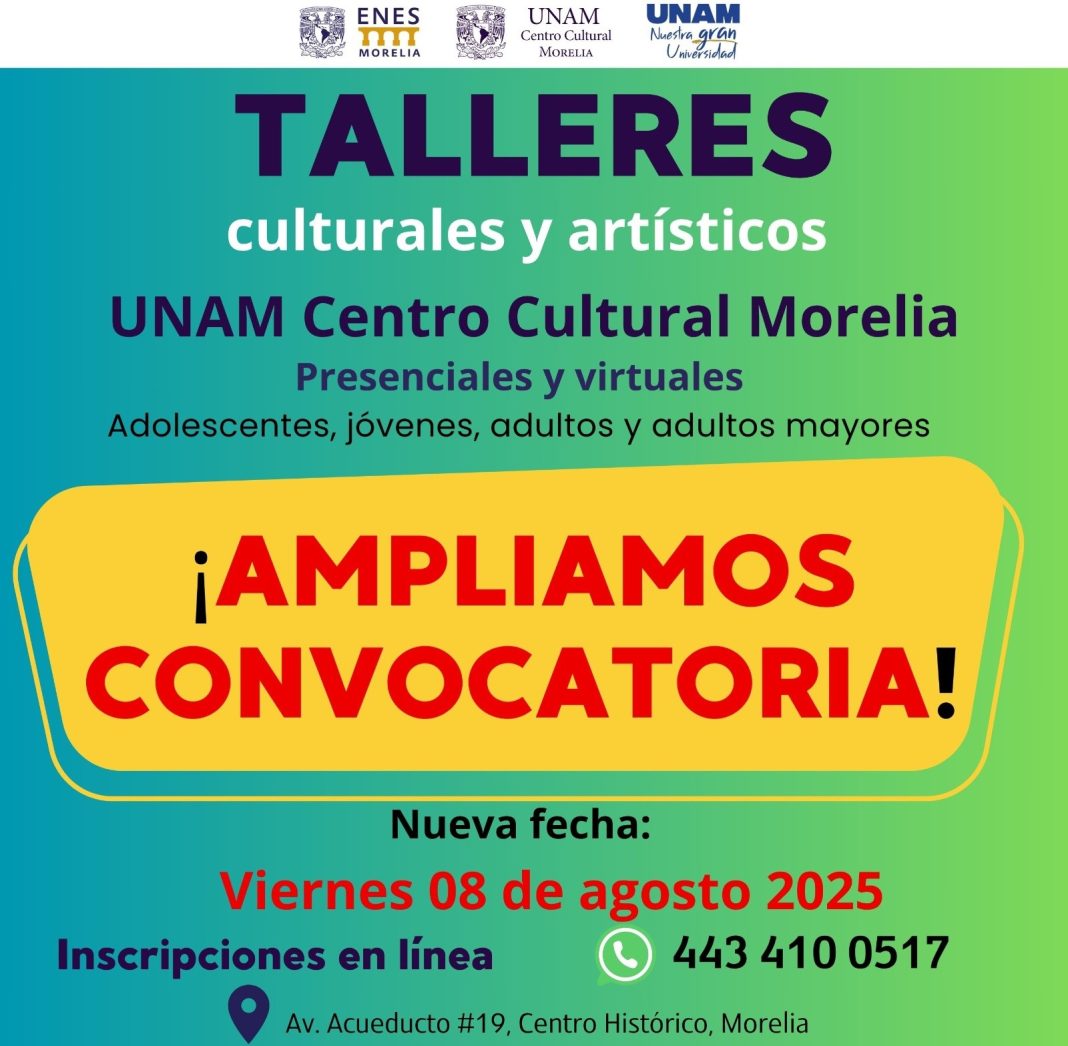 en la página de la ENES Morelia UNAM: https://www.enesmorelia.unam.mx/talleres-culturales-y-artisticos-unam-centro-cultural-2025/