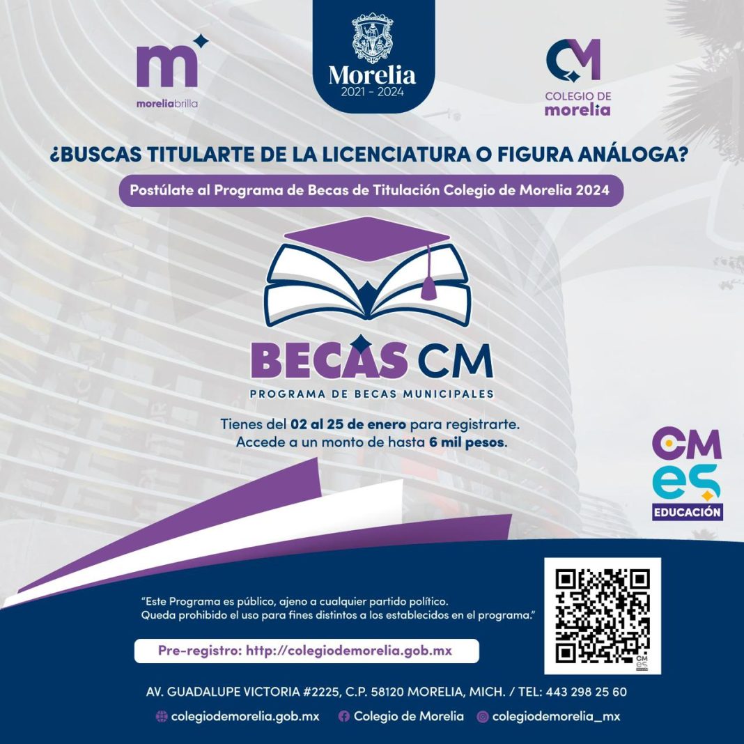 El Colegio de Morelia (CM) invita a las y los morelianos a participar en la convocatoria de su programa de Becas para Titulación 2024, que abre registros este martes y cerrará registros el próximo 25 de enero.