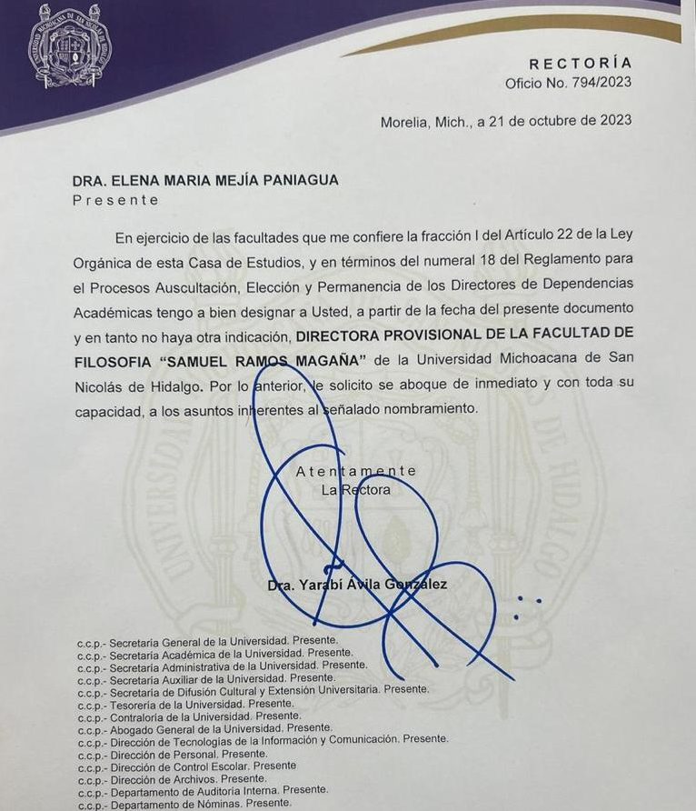 Elena María Mejía Paniagua ha recibido el nombramiento de directora provisional de la Facultad de Filosofía “Dr. Samuel Ramos Magaña”, de la Universidad Michoacana de San Nicolás de Hidalgo (UMSNH), luego de que Carlos Bustamante Penilla presentara su renuncia al cargo. Mañana a primera hora asumirá formalmente la encomienda.