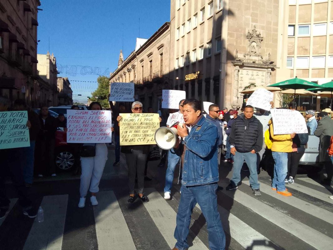 En demanda del pago de su primera quincena de diciembre, el aguinaldo de 60 días, la canasta navideña y la prima vacacional, sueumistas han bloqueado el acceso a Colegio de San Nicolás esta mañana de lunes, y por ello se han apostado desde temprana hora en ese tramo de la Avenida Madero impidiendo también el paso vehicular.